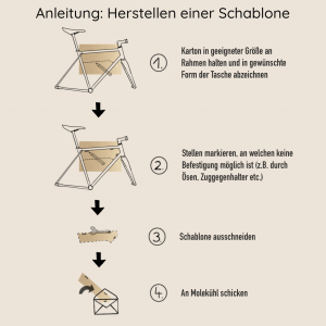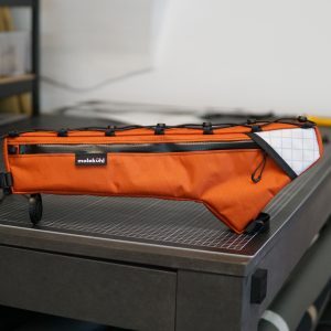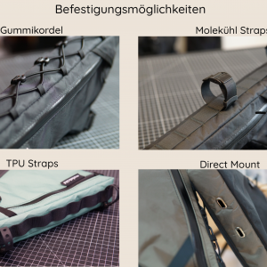 Die 1/3 Frame Bag füllt etwa ein Drittel deines Fahrradrahmens aus und ist damit ideal als Ergänzung für dein Bikepacking-Setup für Mehrtagestouren, wenn du deine beiden Flaschenhalter noch nutzen möchtest oder auch als Daily-Tasche bzw. für Eintagestouren. Durch die Anfertigung der Größe nach deiner Schablone, passt die Tasche perfekt in deinen Rahmen – hierfür bitte die Anweisungen der Darstellung in der Galerie befolgen. Du kannst wählen, ob das Hauptfach in Fahrtrichtung rechts oder links sein soll und ob ein zusätzliches Einschubfach auf der gegenüberliegenden Seite eingearbeitet werden soll. Außen gibt es mehrere Farbkombinationen, wobei innen einfarbig bleibt. Die Befestigung am Rahmen kann durch Straps von Molekühl, TPU Straps, Laschen mit Gummikordel oder Direct Mount erfolgen. Der dabei verwendete Reißverschluss ist sehr strapazierfähig, langlebig und wasserdicht.