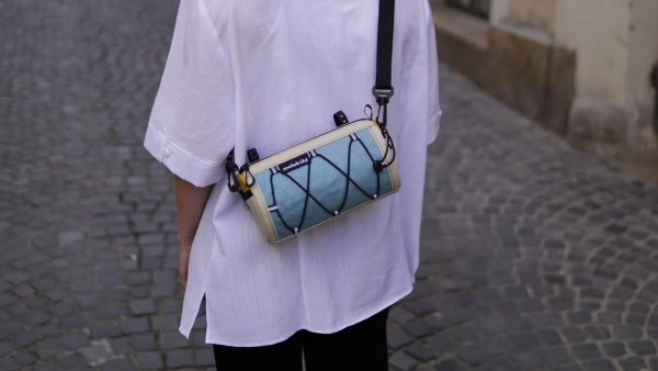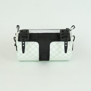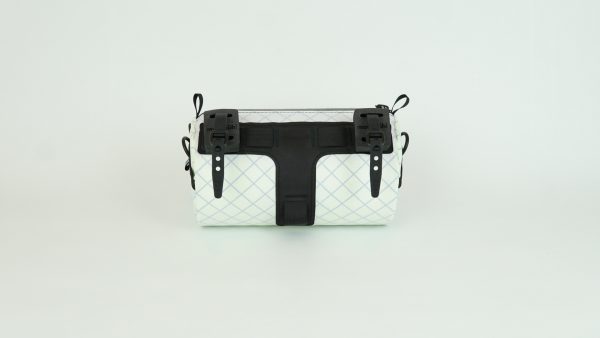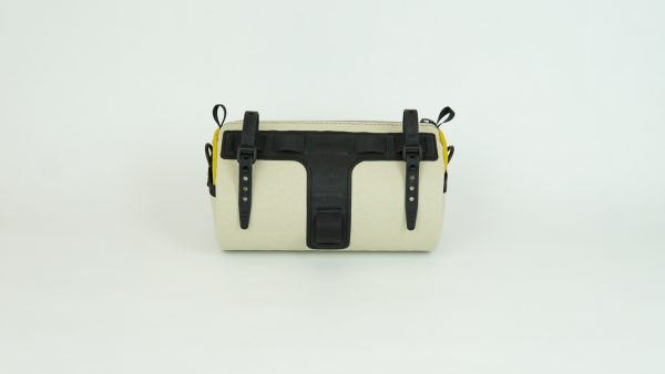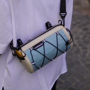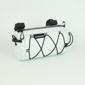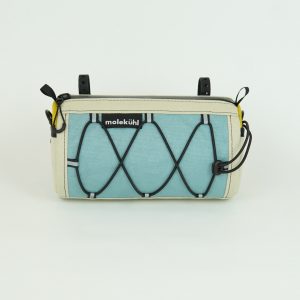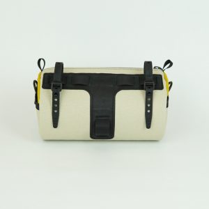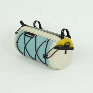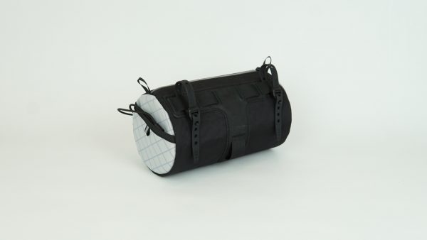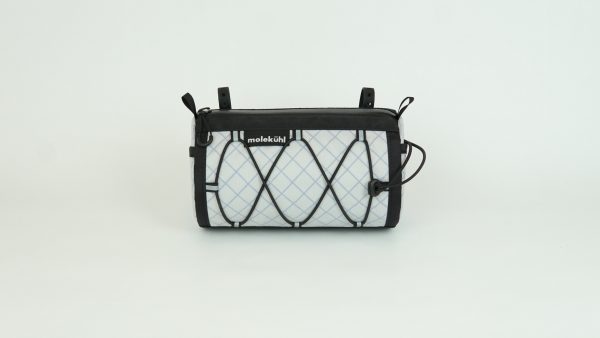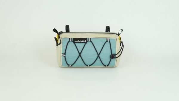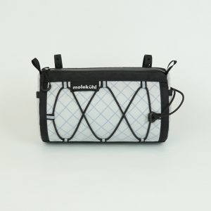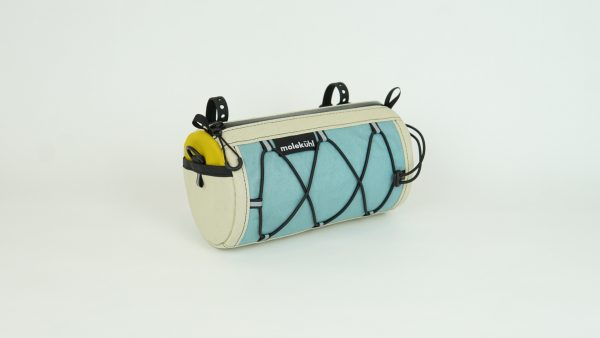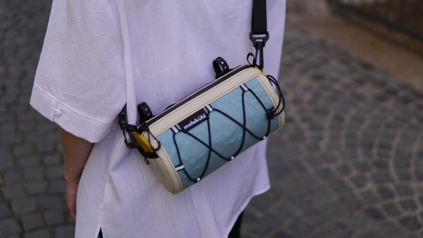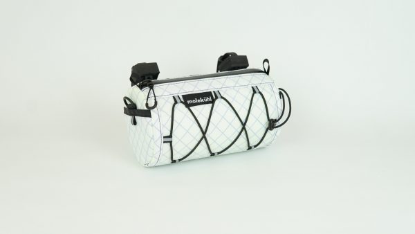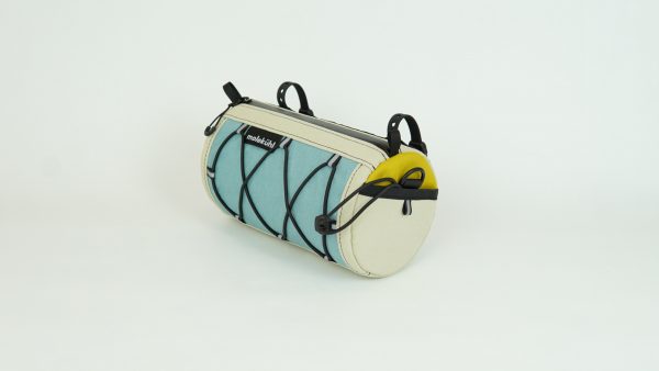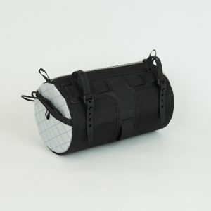 Die Rolle wird mit zwei Straps am Lenker und mit einer Gummikordel am Steuerrohr befestigt. Dabei kann man zwei Positionen am in house gelaserten Montagesystem wählen, welche unterschiedlich weit voneinander entfernt sind. Durch die eingearbeitete HDPE-Platte ist die Rolle so steif, dass sie auch bei sehr kleinen Rahmen passt und nicht am Vorderreifen aufschlägt. Die einzelnen Bestandteile wie Stoff und Reissverschluss sind wasserdicht, die Tasche im Gesamten ist stark wasserabweisend.